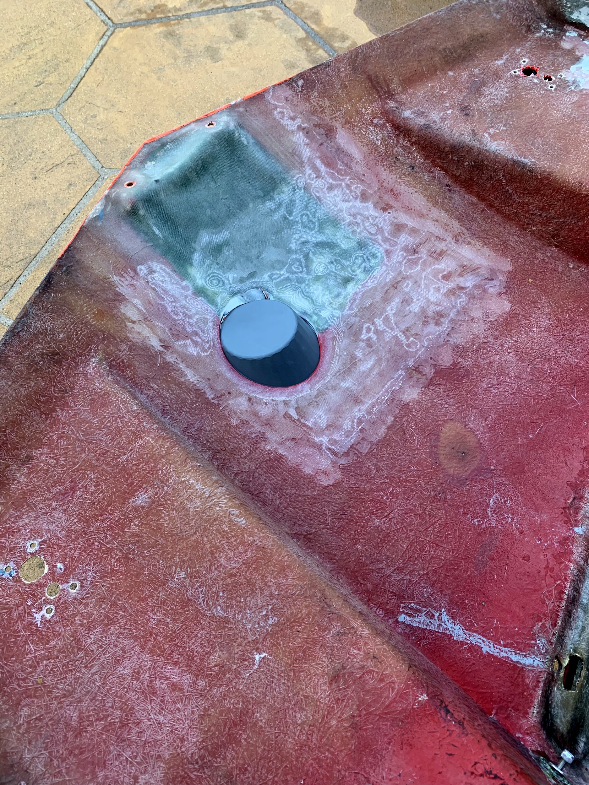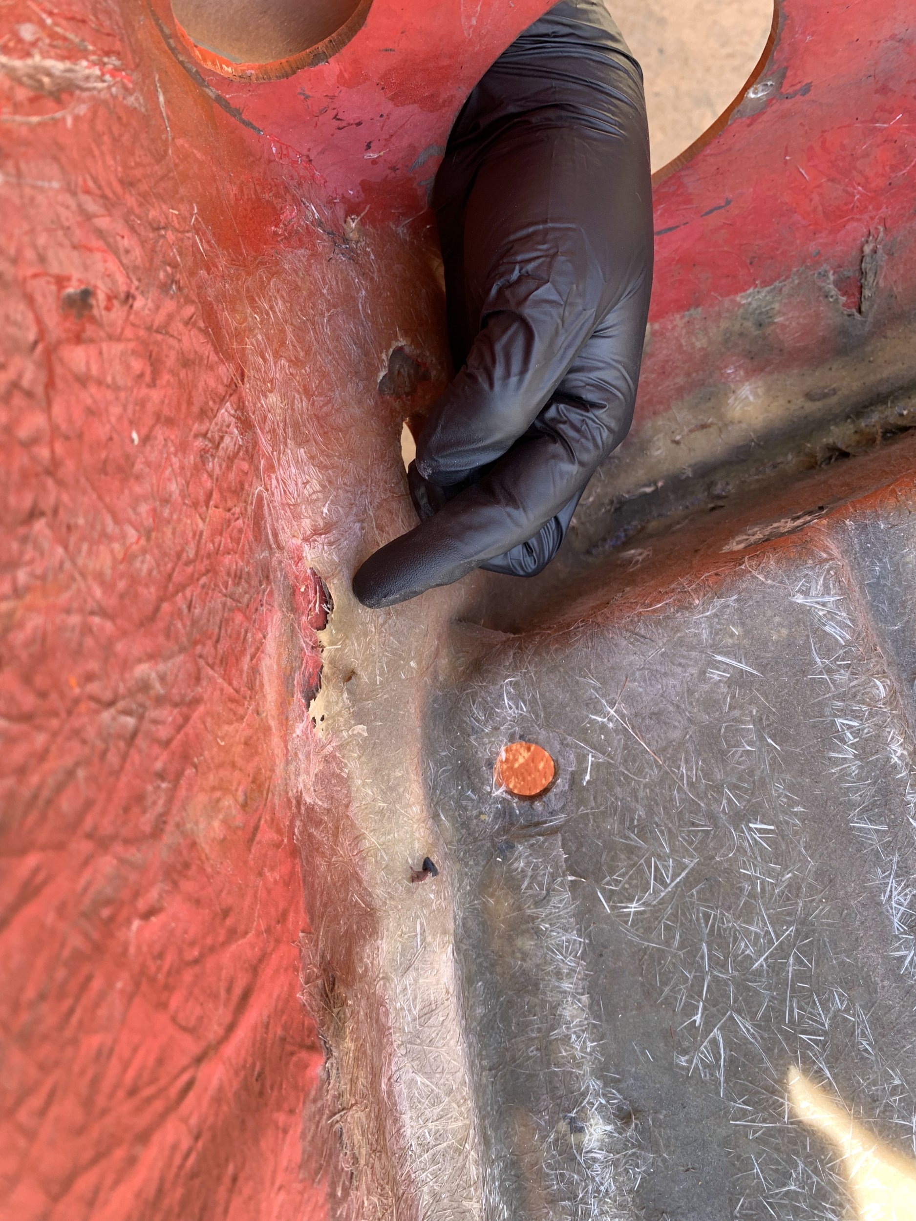 You can also see an existing (old) patch someone did on the nose here. I’m guessing they hit something (a curb?), and dented the lower nose a bit, and then did a (really poor) job adding glass on top of it to try to fix it. I imagine I’d find a bunch of body filler on the other side if I went looking (I don’t want to go looking). I’m also taking the opportunity to substantially improve that repair too.