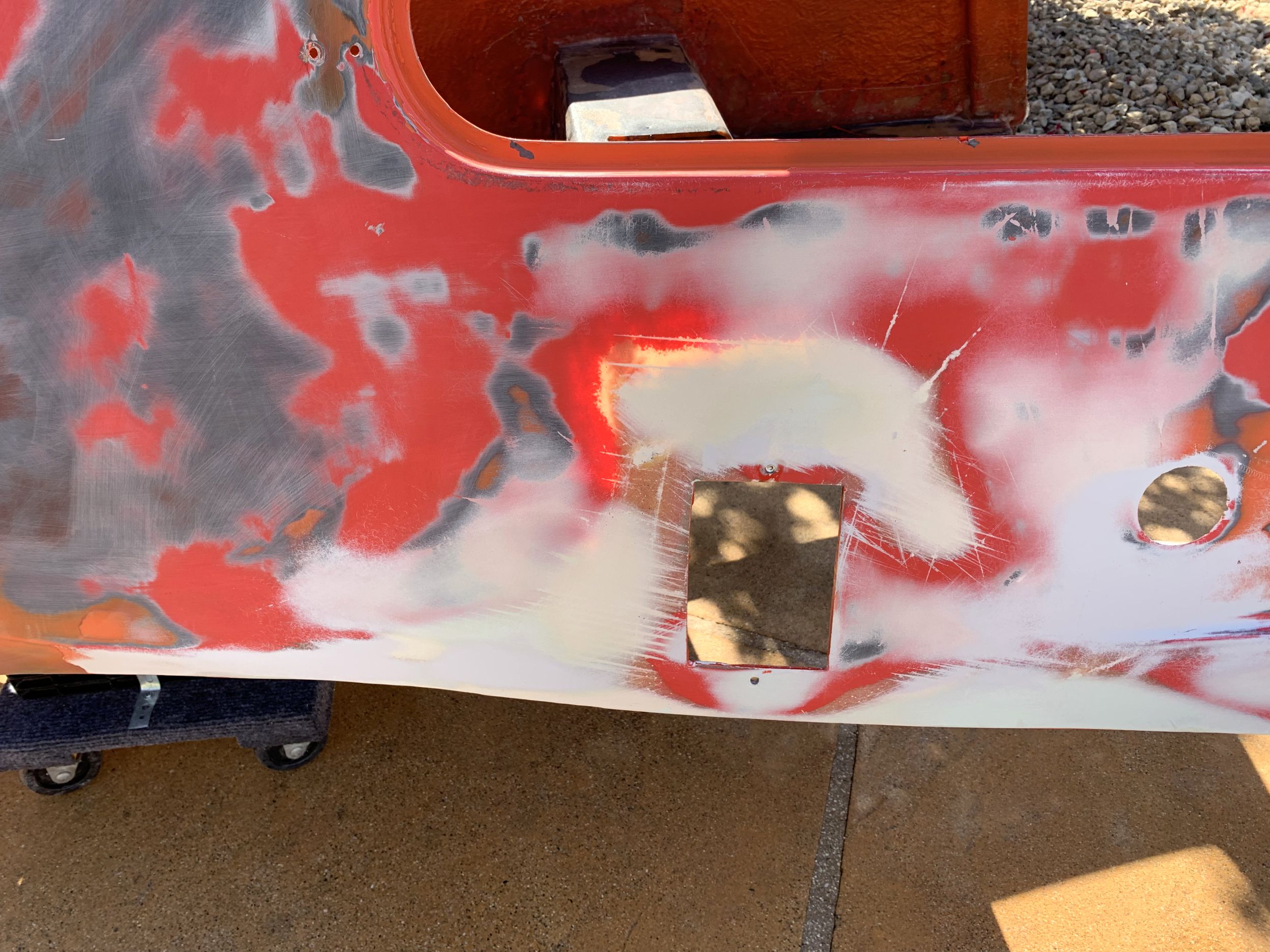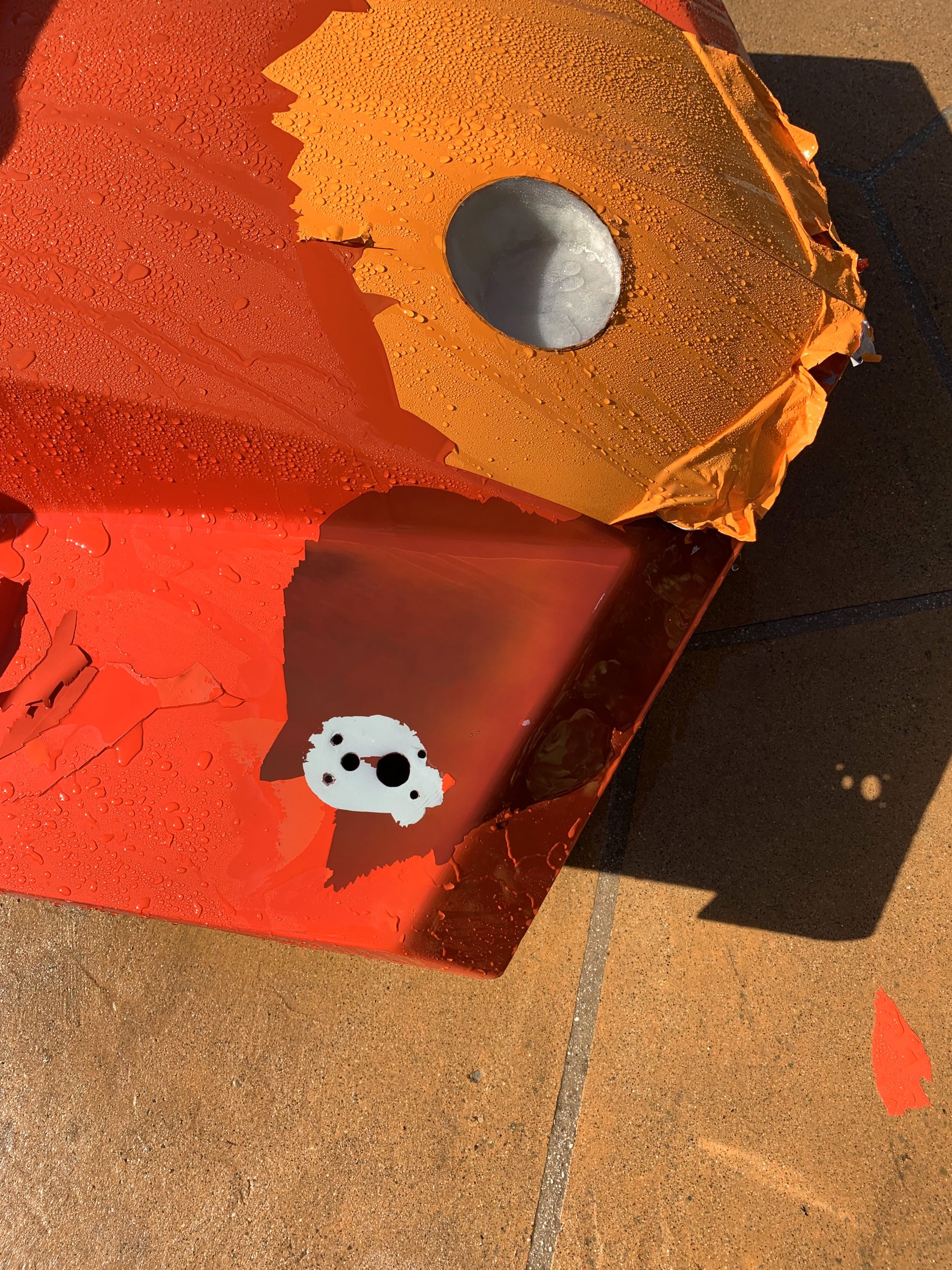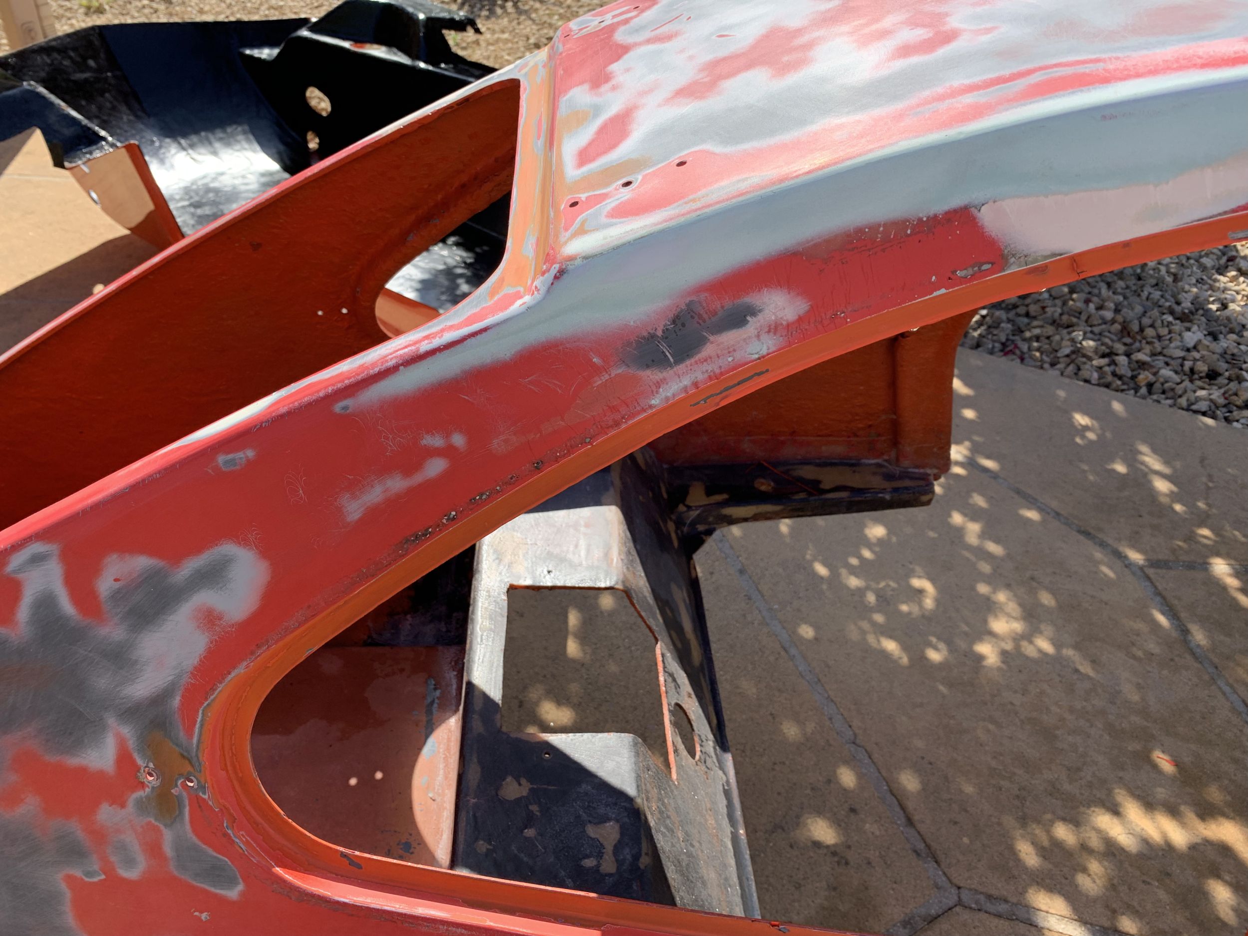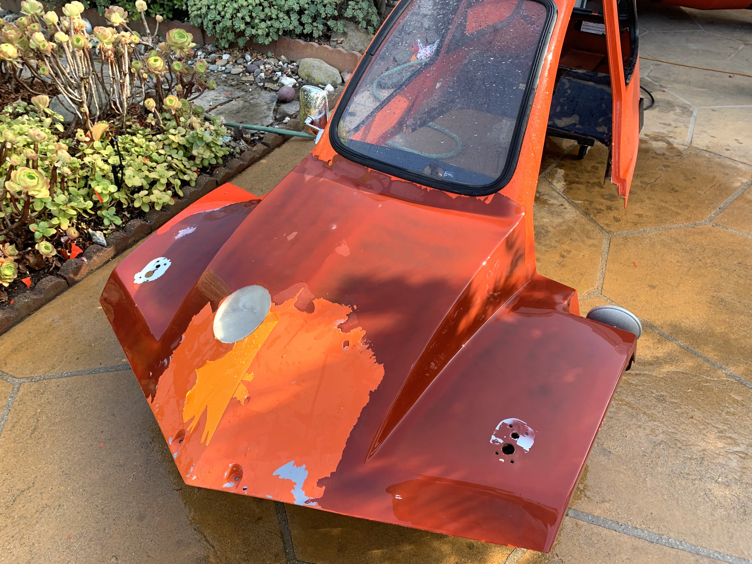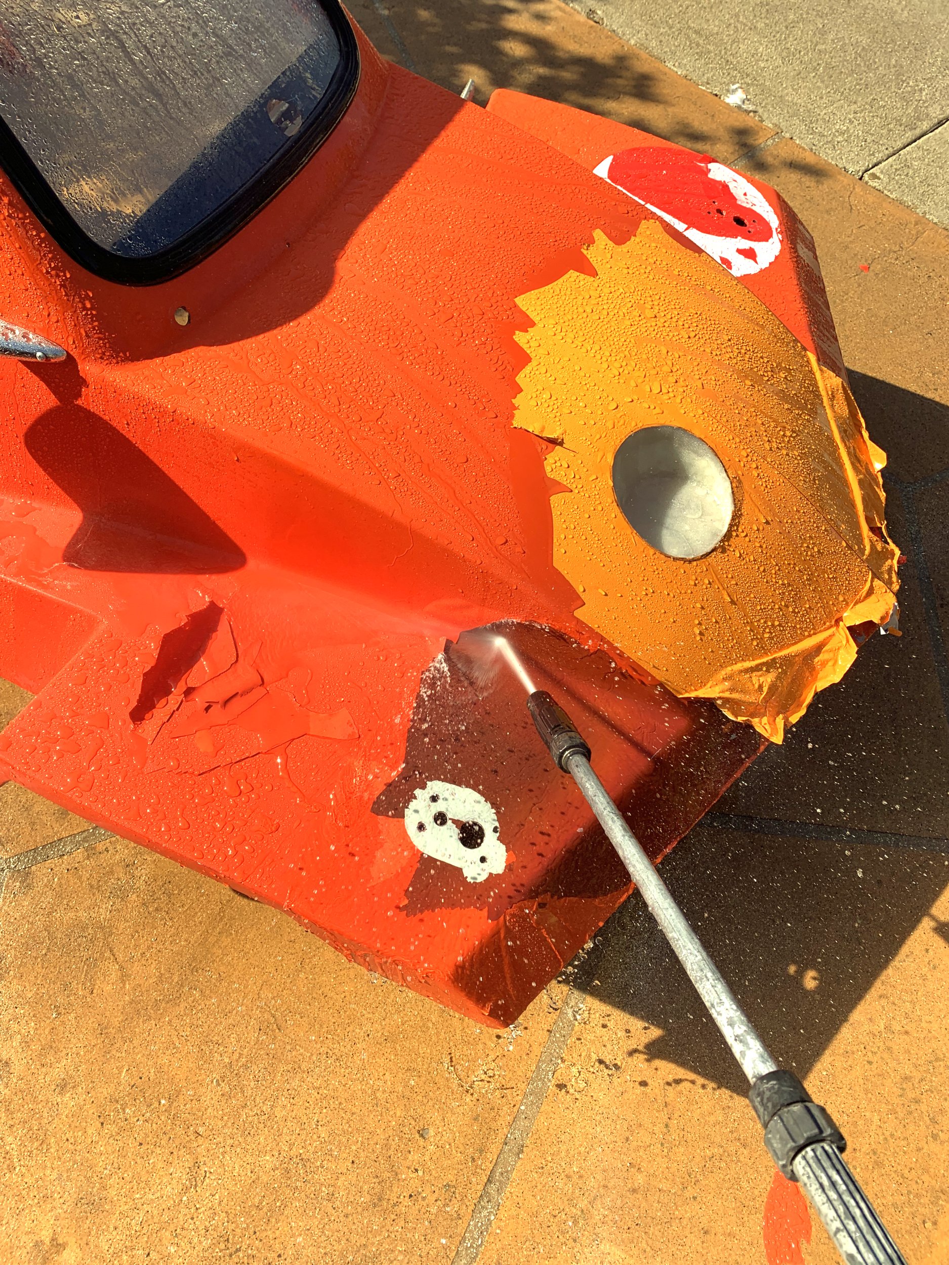 So, the final issue I had here is that after I had done all the fiberglass work, I was powerwashing the body again, primary to remove some of the vinyl stickers I had been experimenting with, and well, apparently whoever did the orange/red paint on top of the original red paint did a completely shit job.