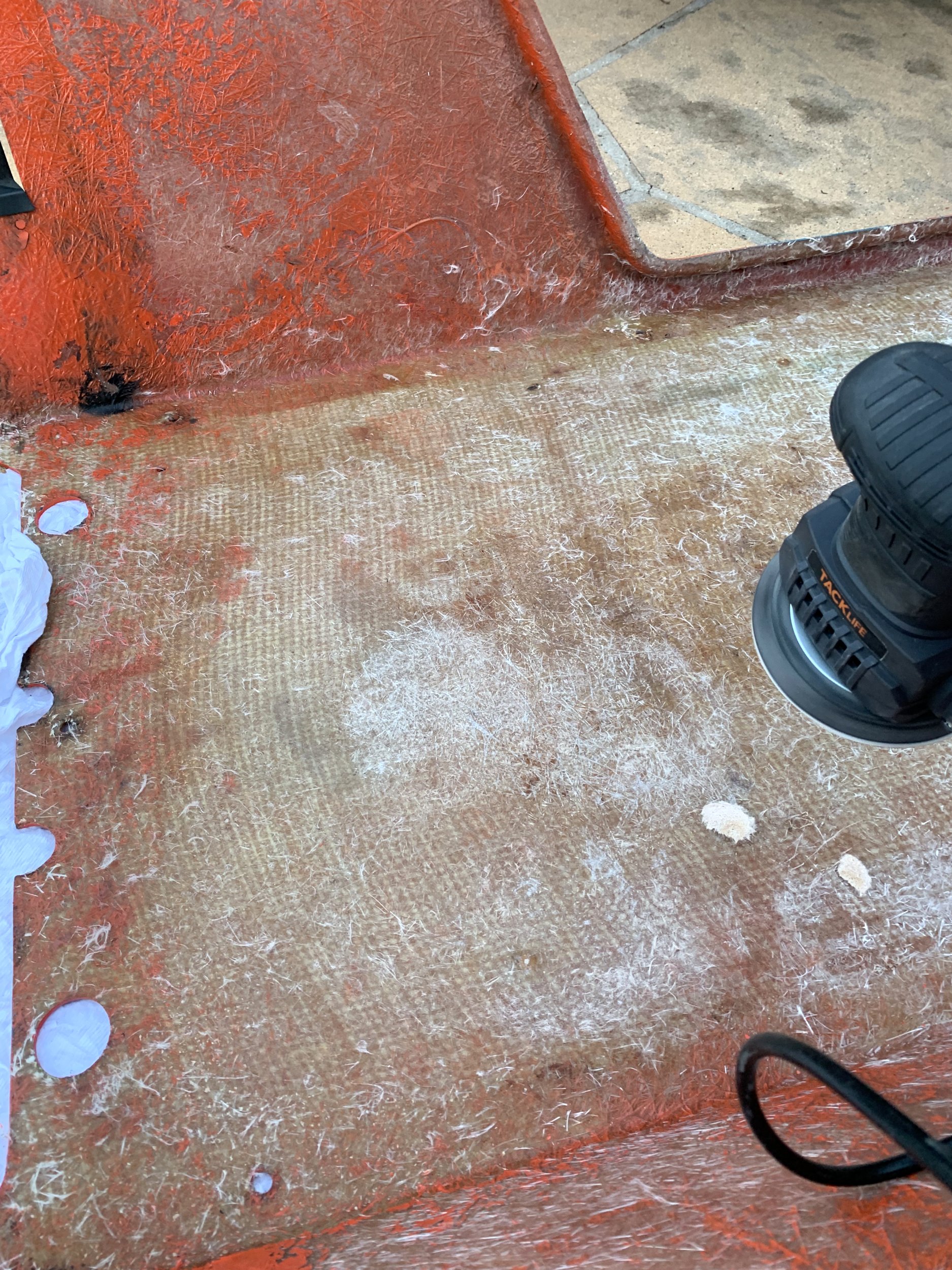 I also went around with a smaller sanding pad and cleaned up a bunch of areas on the underside where there was crappy fiberglass work from the manufacturer:
