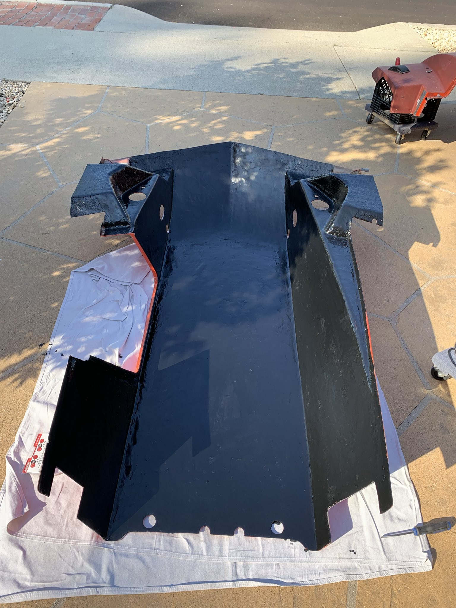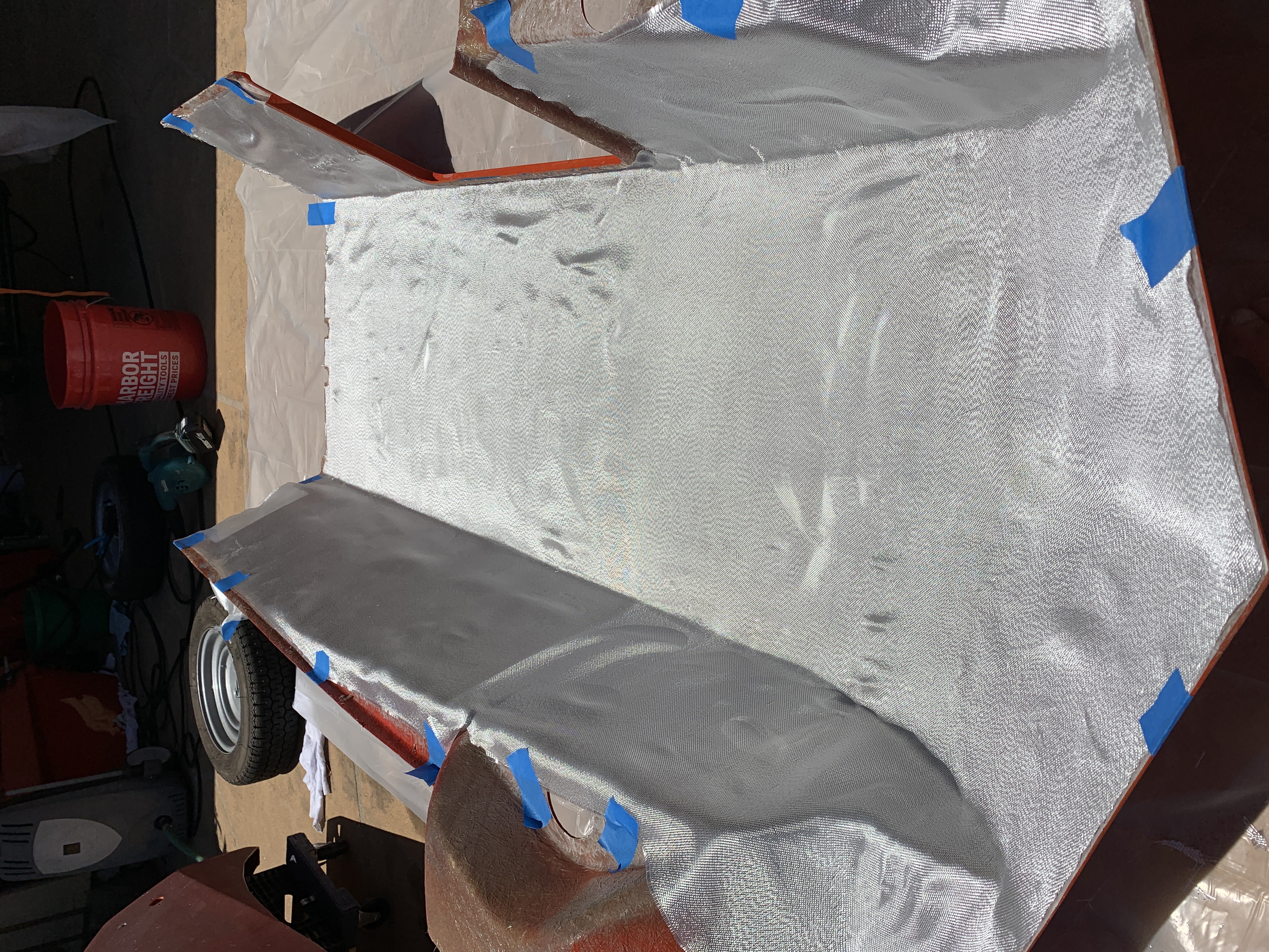 Not shown: I then spent about the next 4 hours mixing resin, and piecemeal wetting out the fabric. This is a large, rather fiddly surface to be coating, and it’s really not a project only one person should be doing, let alone directly in the hot sun. I had a number of issues that boiled down to areas gelling and hardening before I had a change to properly wet them out fully. I also ran out of resin 3/4 of the way through (even after buying a additional quart of resin before hand), and had to run out and buy more.