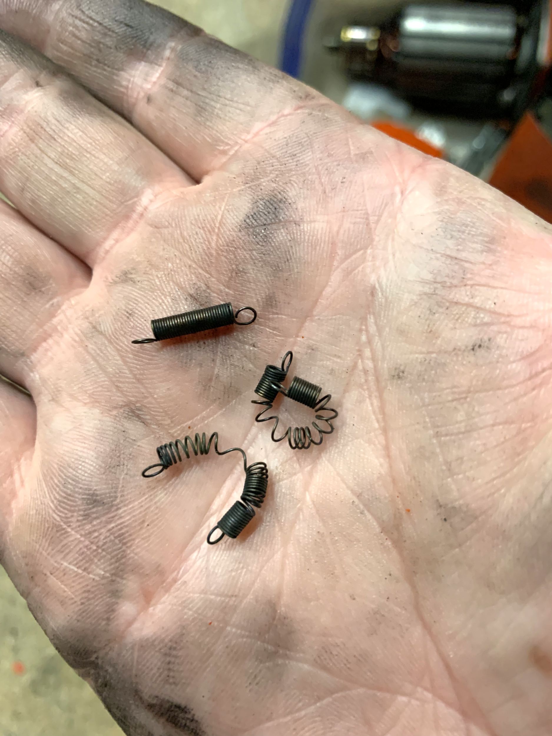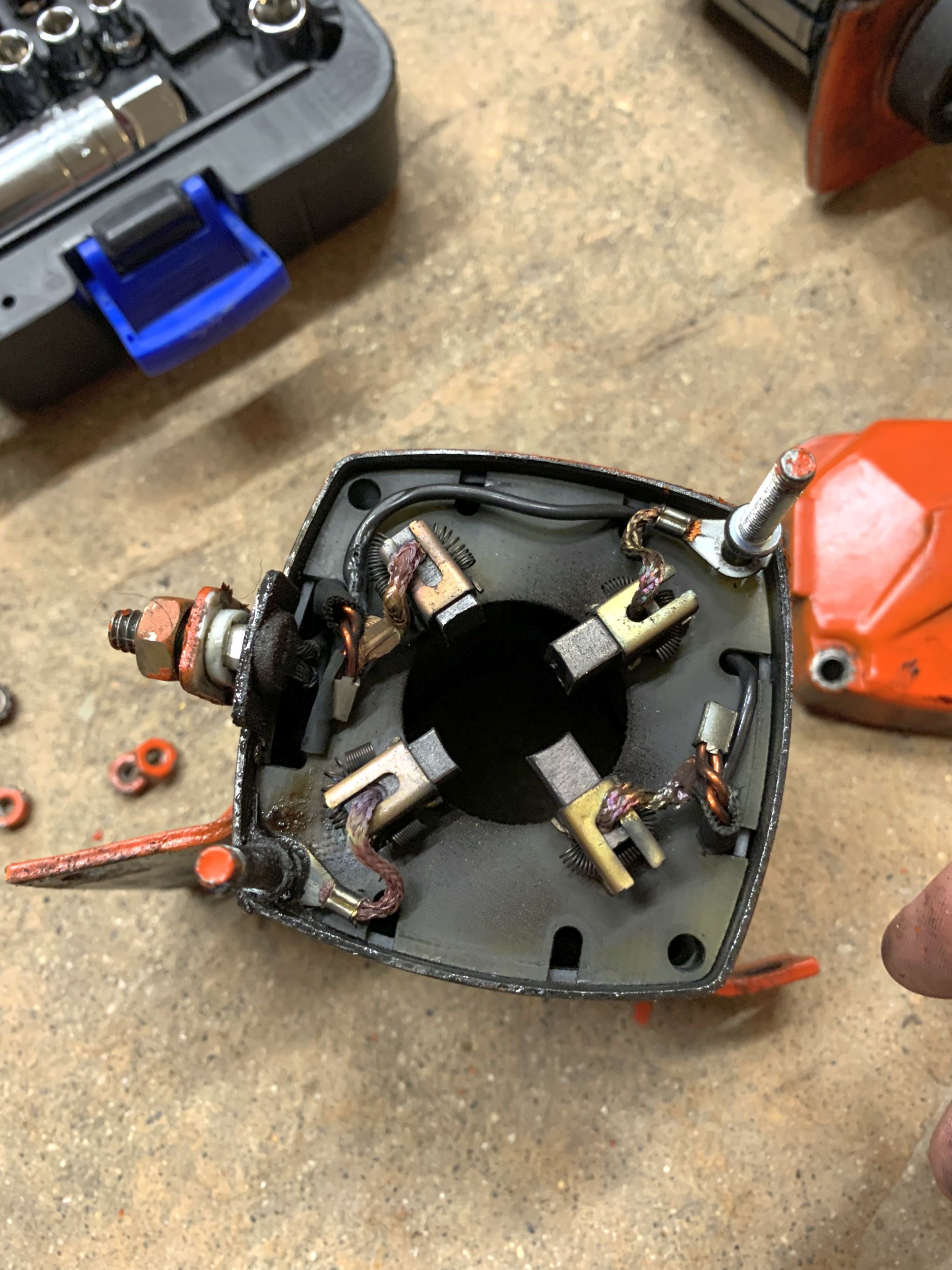My assumption was it overheated at some point, and the springs got hot enough that they deformed and annealed enough to lose their springyness. One of the carbon brushes was stuck in it’s brass guide, and the two failed brush guides have pretty obvious temperature related discolouration.