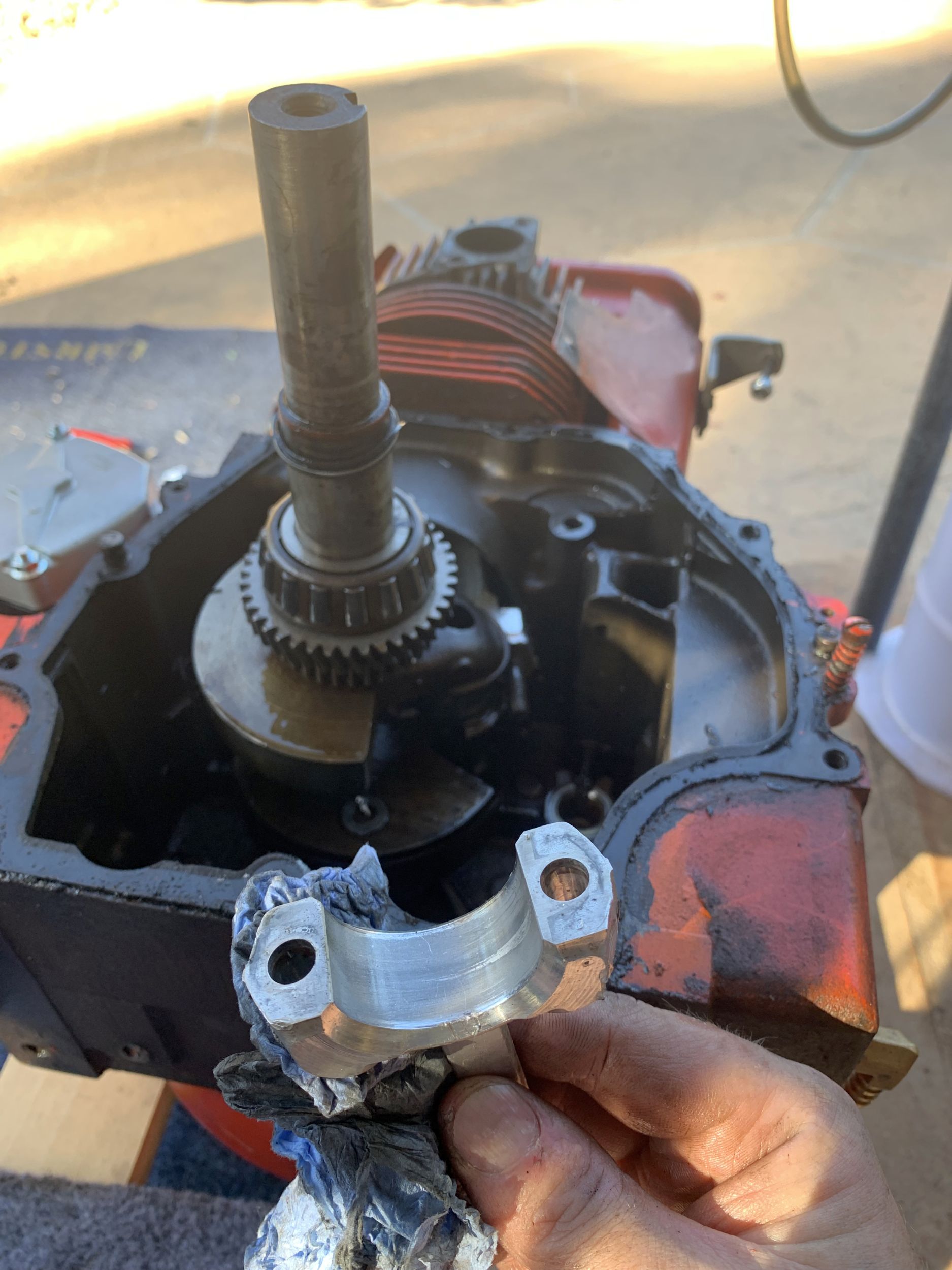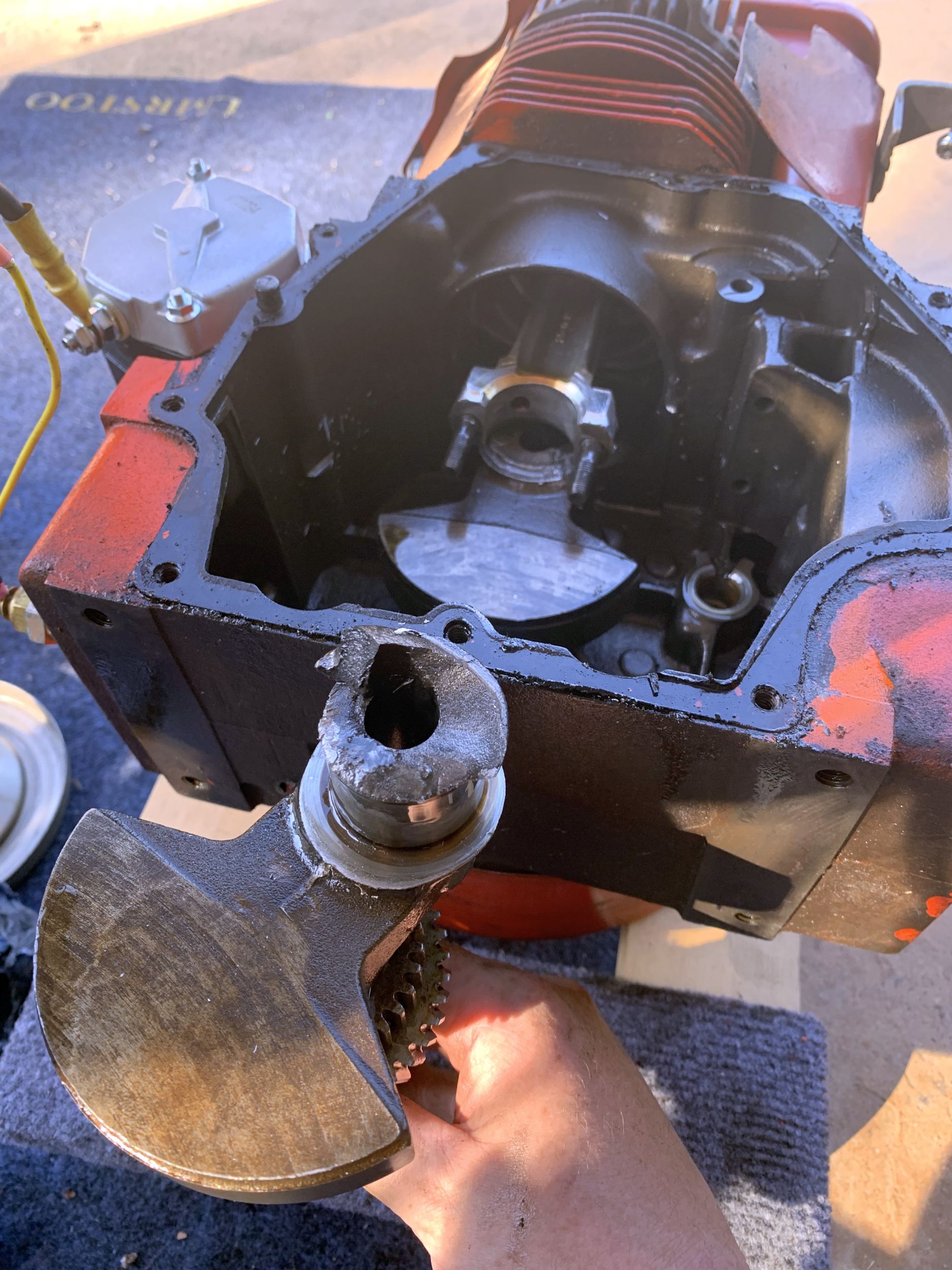 I could then do a post-mortem. I initially assumed this was just a siezed piston/bearing, since I had removed the governor on the engine a while ago. My guess was it was a oil aeration issue since this is a splash-lubricated engine. However, checking the oil it looked fine, though this was admittedly a few days after the failure.