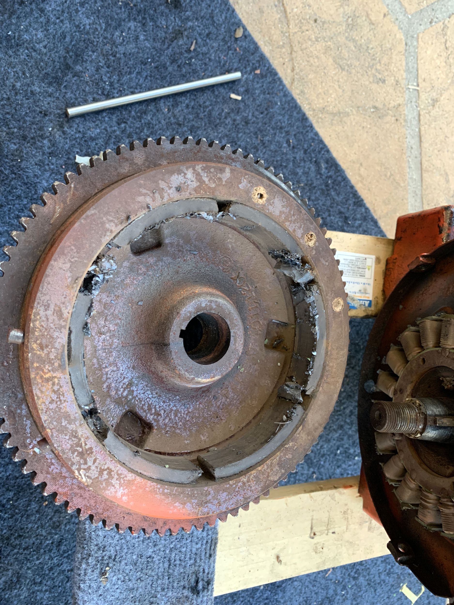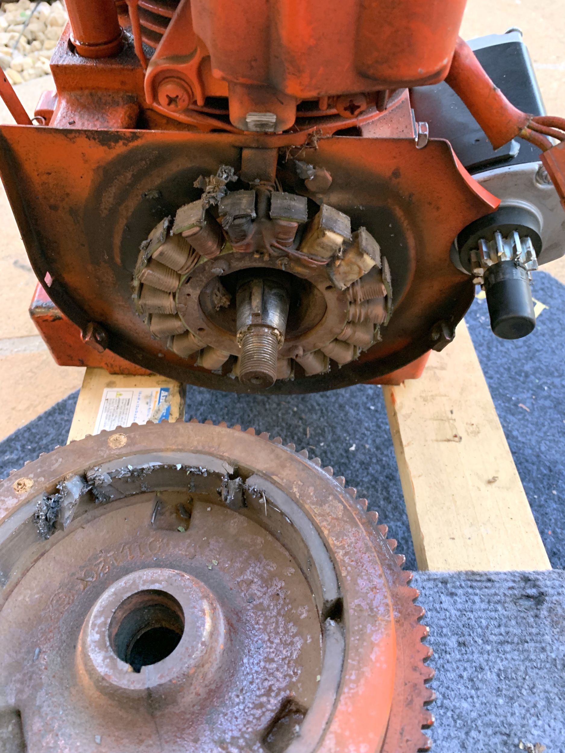 3. That magnet chunk wedges between the stator and the flywheel, causing it to abruptly seize