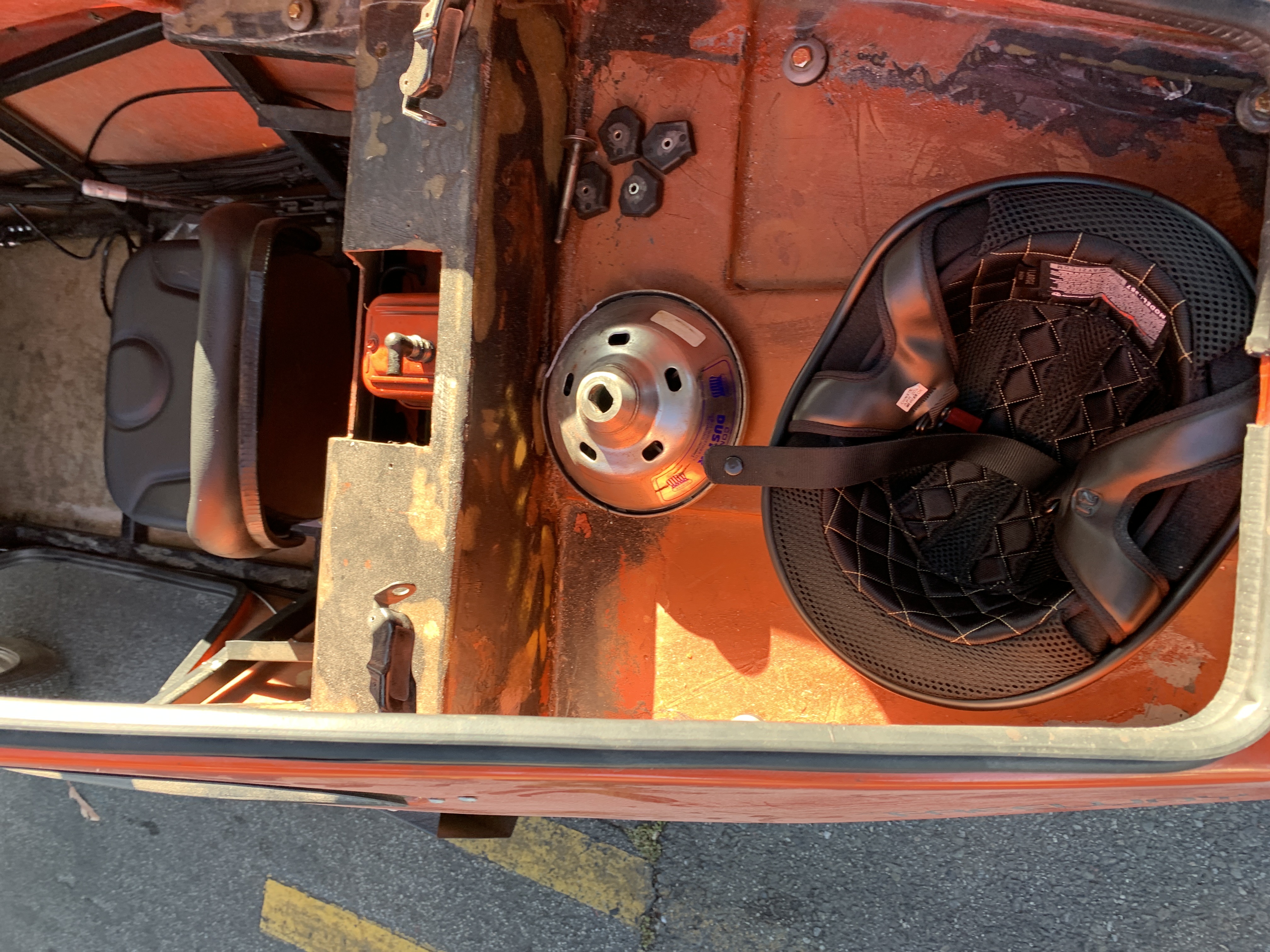 I had determined that the only place the remaining fuel odor could be coming from is dirt and other refuse stuck in the gaps between the steel frame and the fiberglass lower body. I know I certainly spilled a couple tablespoons of gas when removing the tank, mostly out of idiocy and the fuel tank hose having a bit of gas left in it, and it drizzling that fuel all over the floor of the freeway when I accidentally knocked it down from my (inadequate) attempt to prop it up.